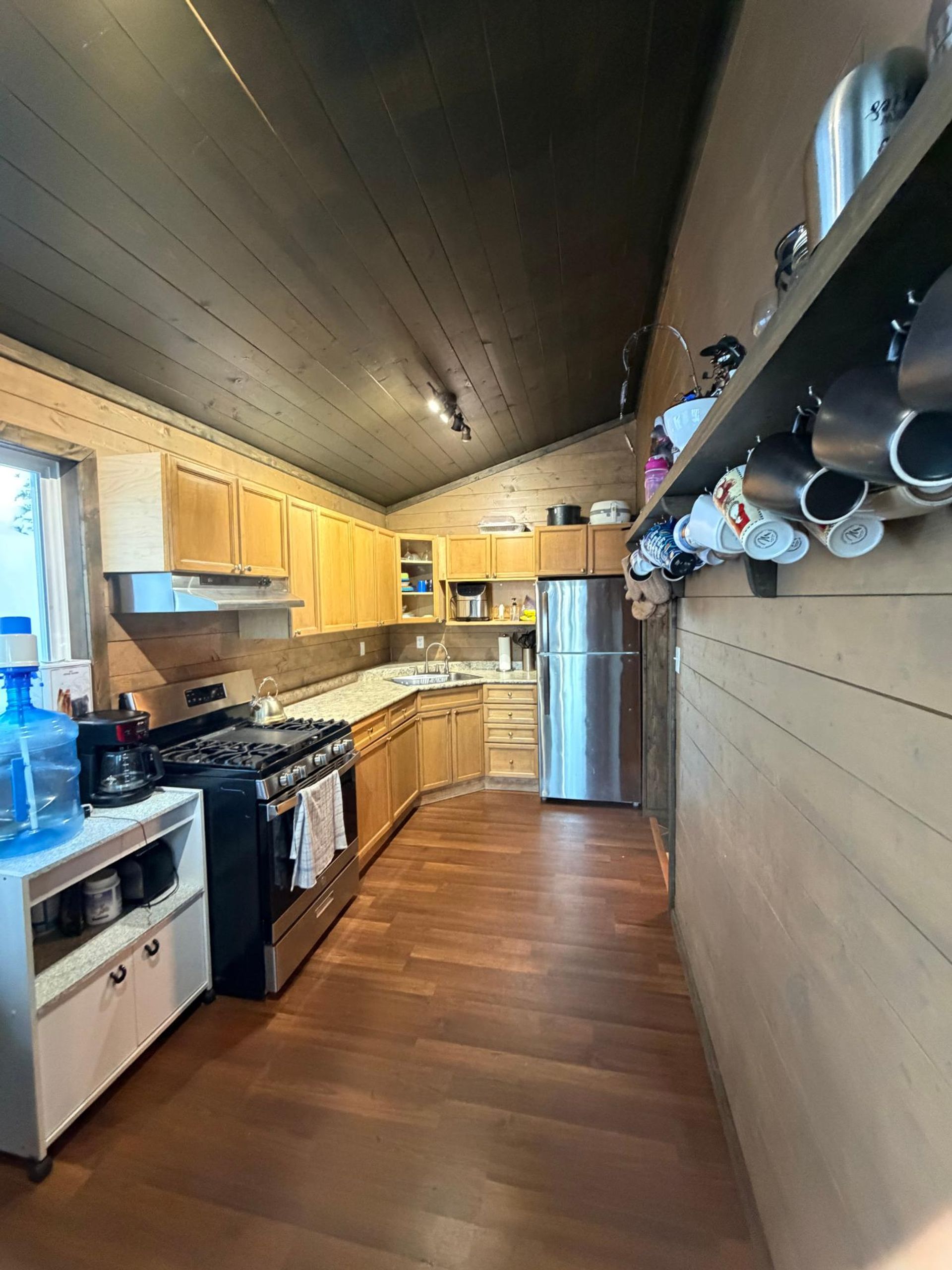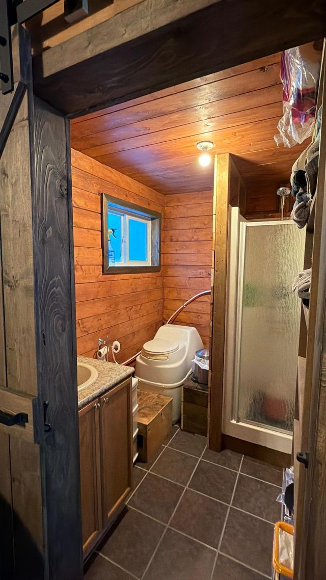 The main level features a bright open living area, a well-appointed eat-in kitchen with full-size fridge and propane stove, two bedrooms, and a bathroom complete with shower and composting toilet. A spacious third bedroom is located in the loft area.