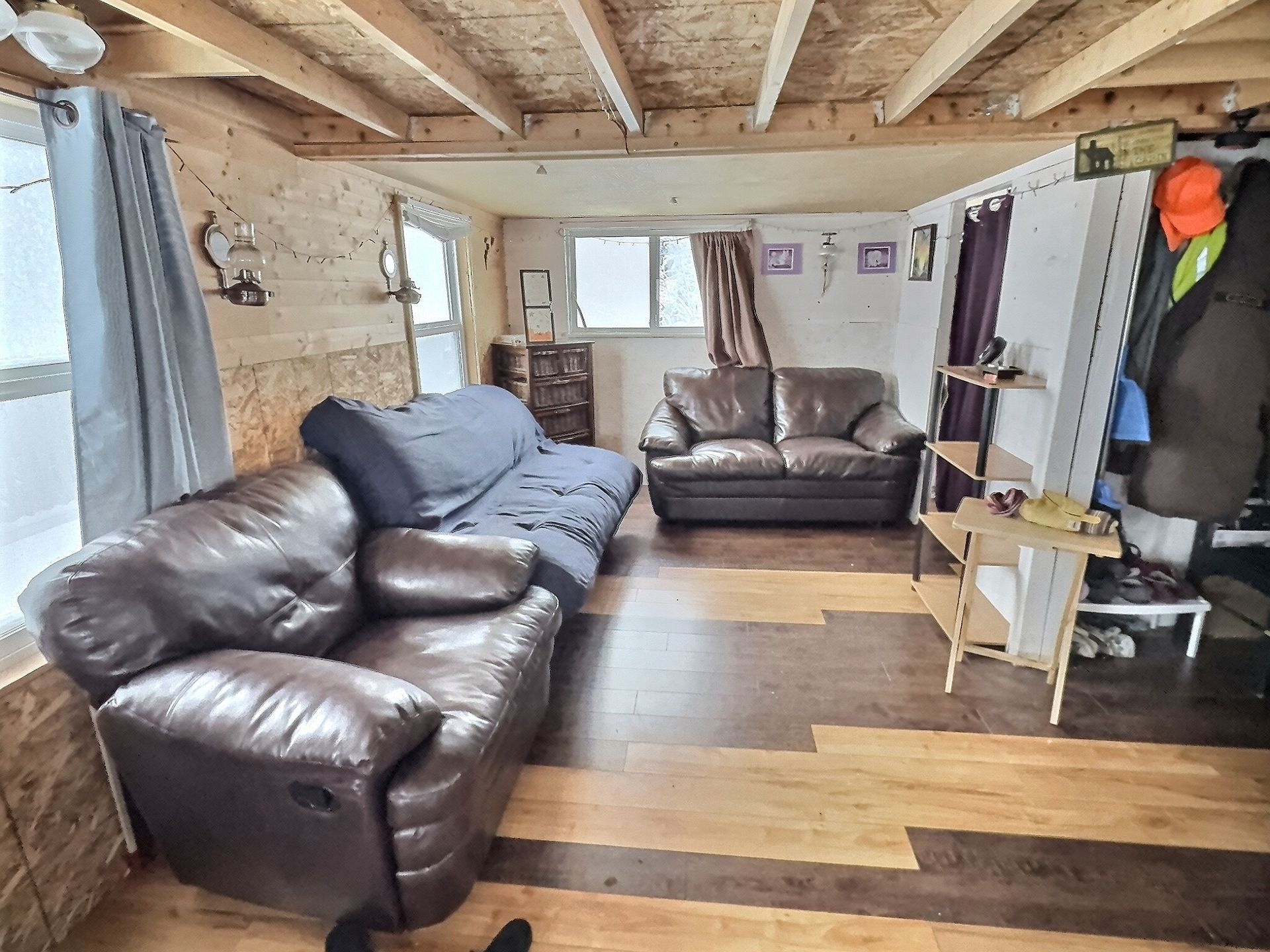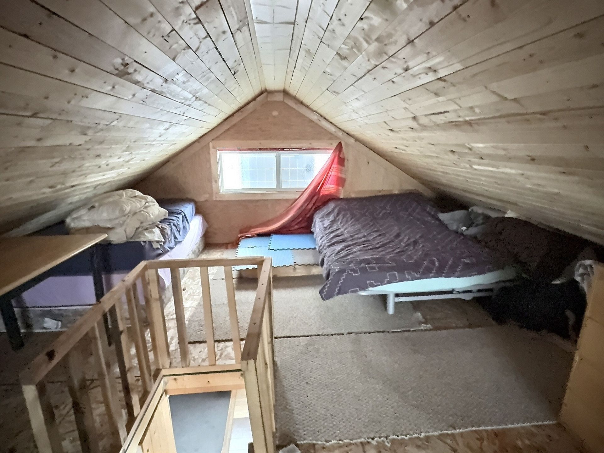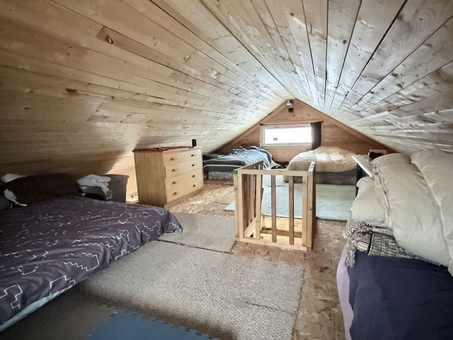 There is also an indoor washroom, and both a wood stove and a propane heater for reliable heat. There is also a small solar system with interior lights Upstairs, a large loft sleeping area comfortably sleeps several people, with 3 double beds and 1 twin bed, making it ideal for families, groups, or hosting guests.