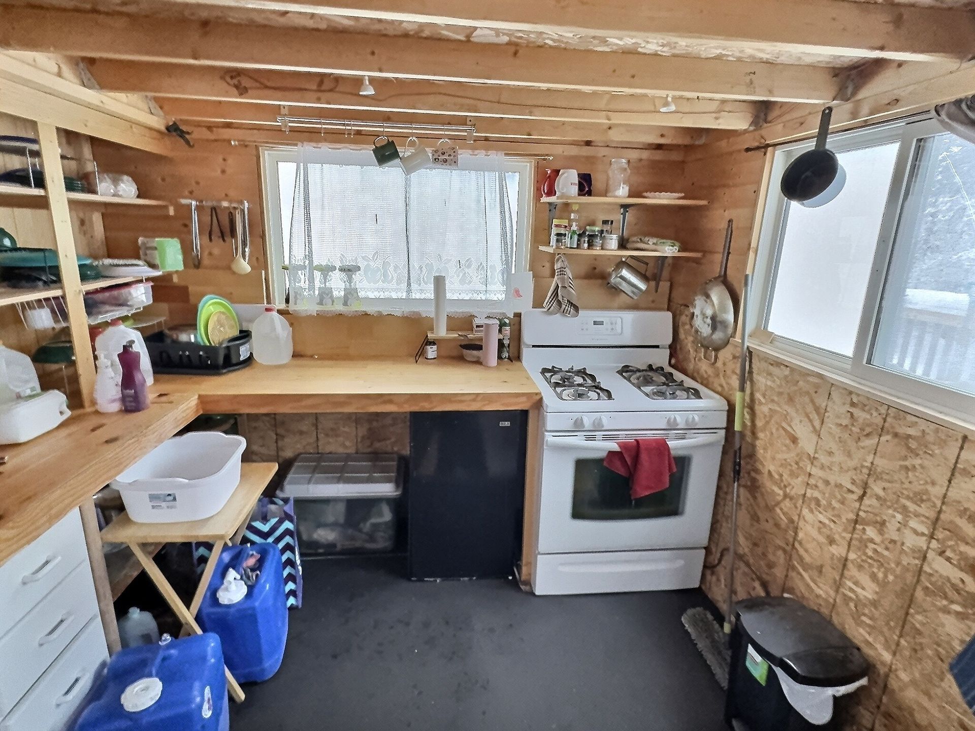 Outside includes a large deck that is on three sides of the cabin, fire pit area, a tool shed, rain collection system, and water supply totes with a pump and hoses for general use and Fire Smarting.