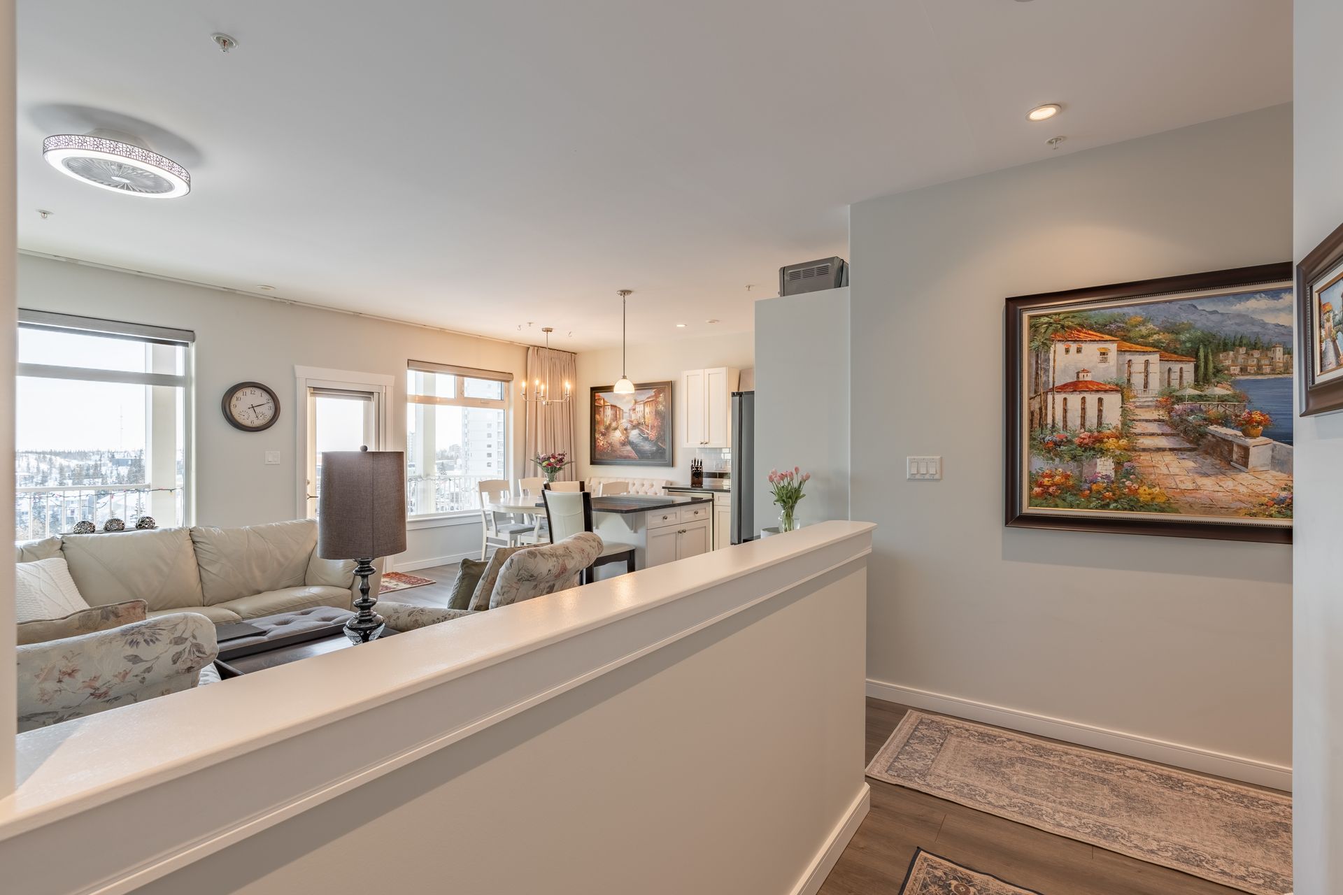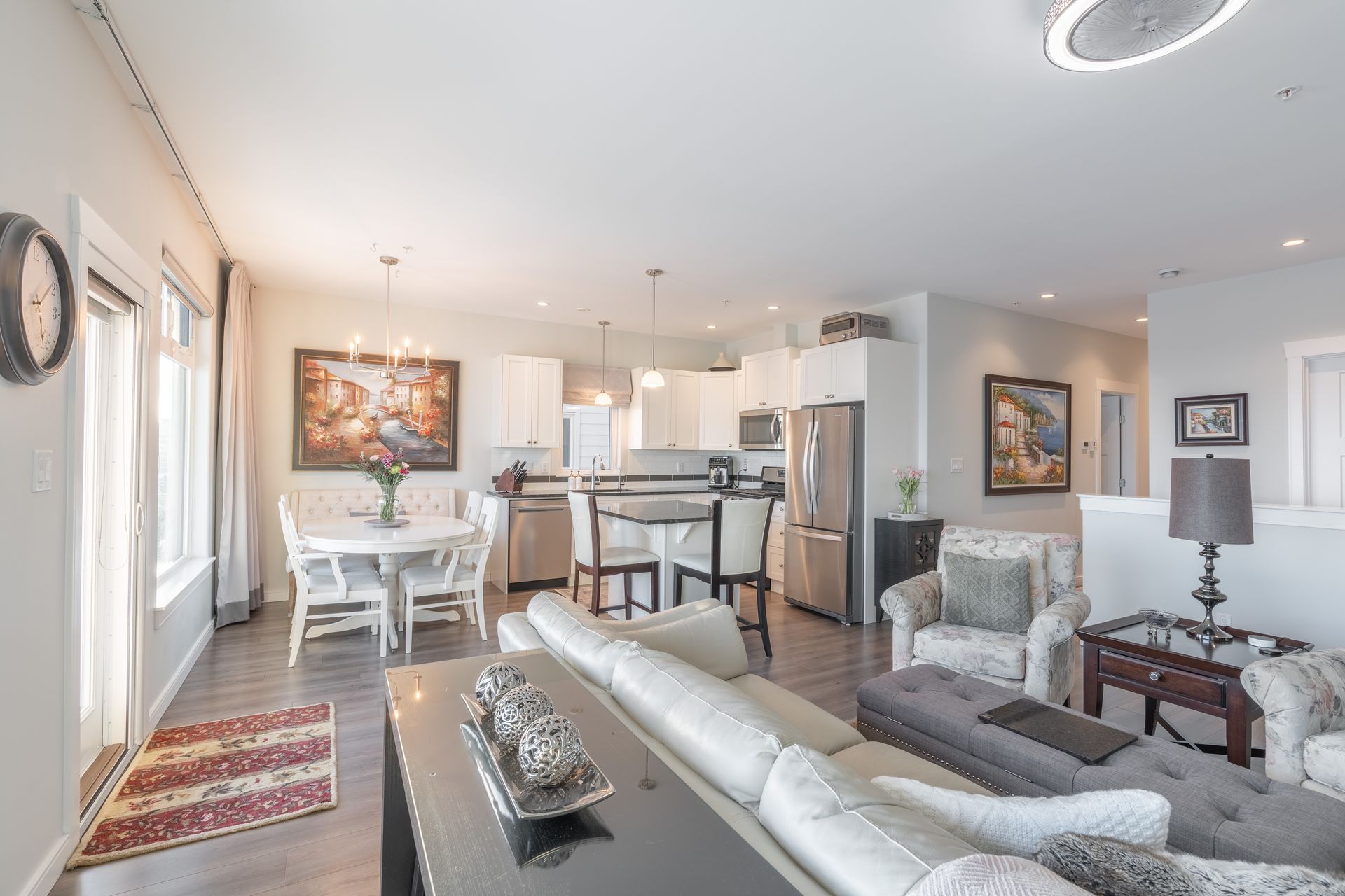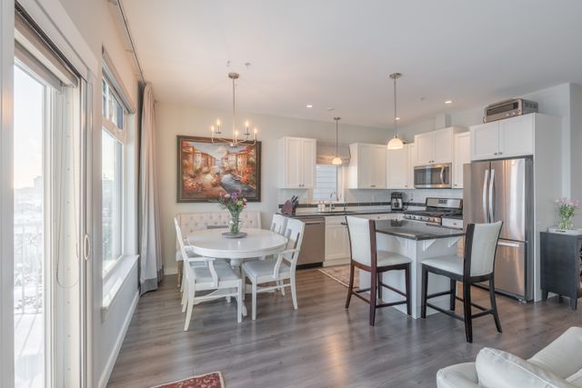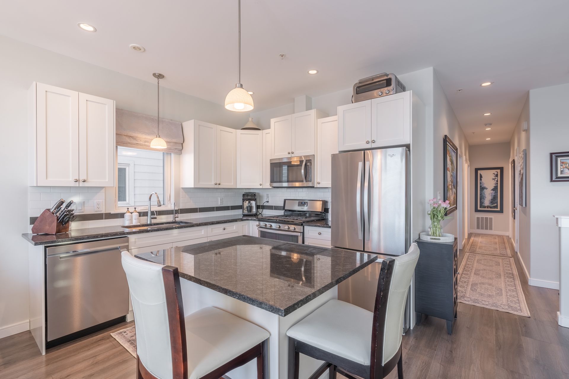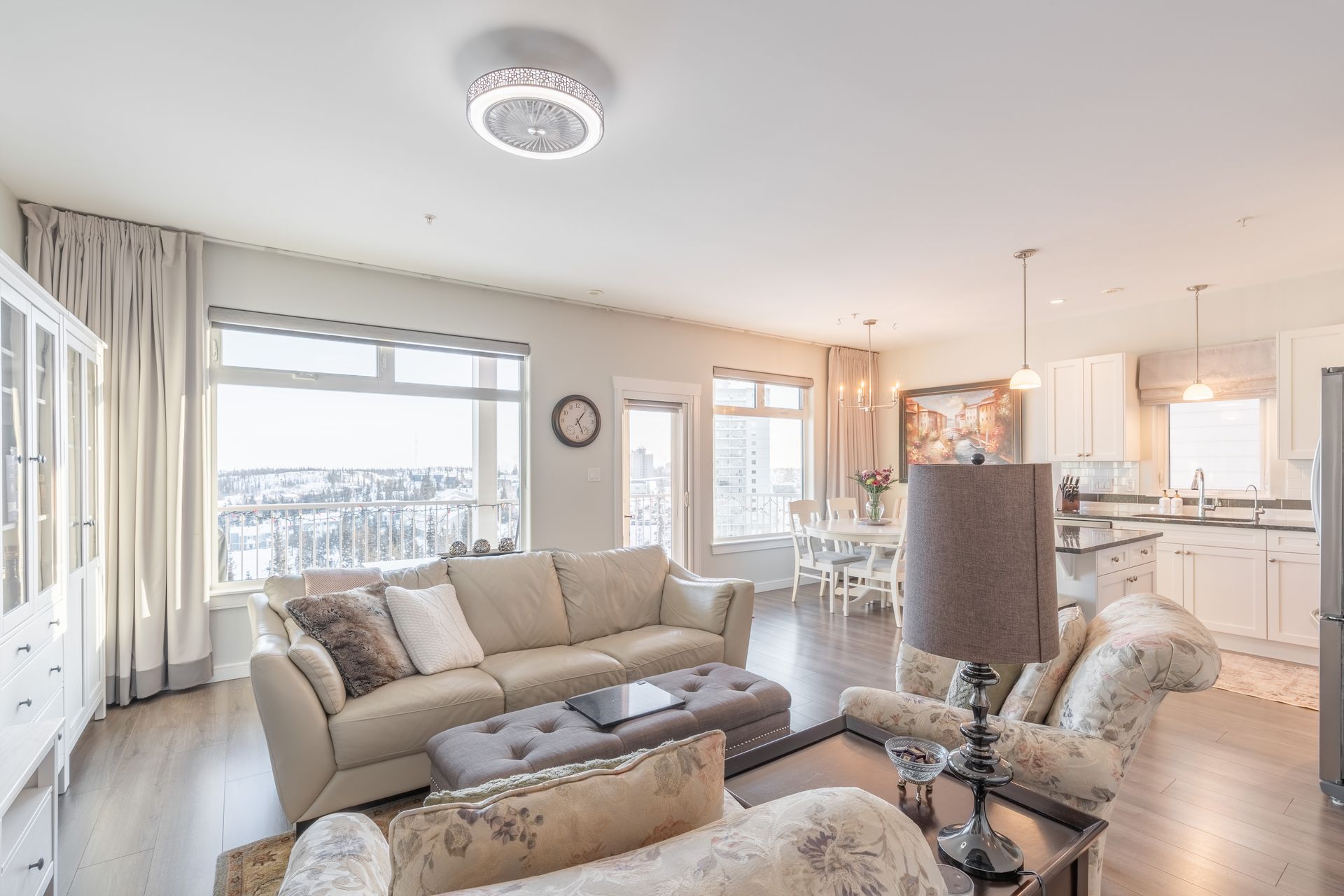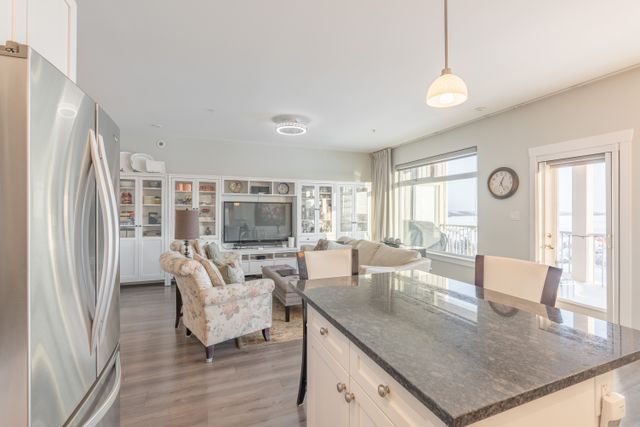The bright, open-concept kitchen and living area showcases the view, with expansive windows filling the space with all day natural light. The kitchen features an island, granite countertops, tiled backsplash, cabinetry with built-in organizers, and stainless steel appliances ideal for everyday living and entertaining.