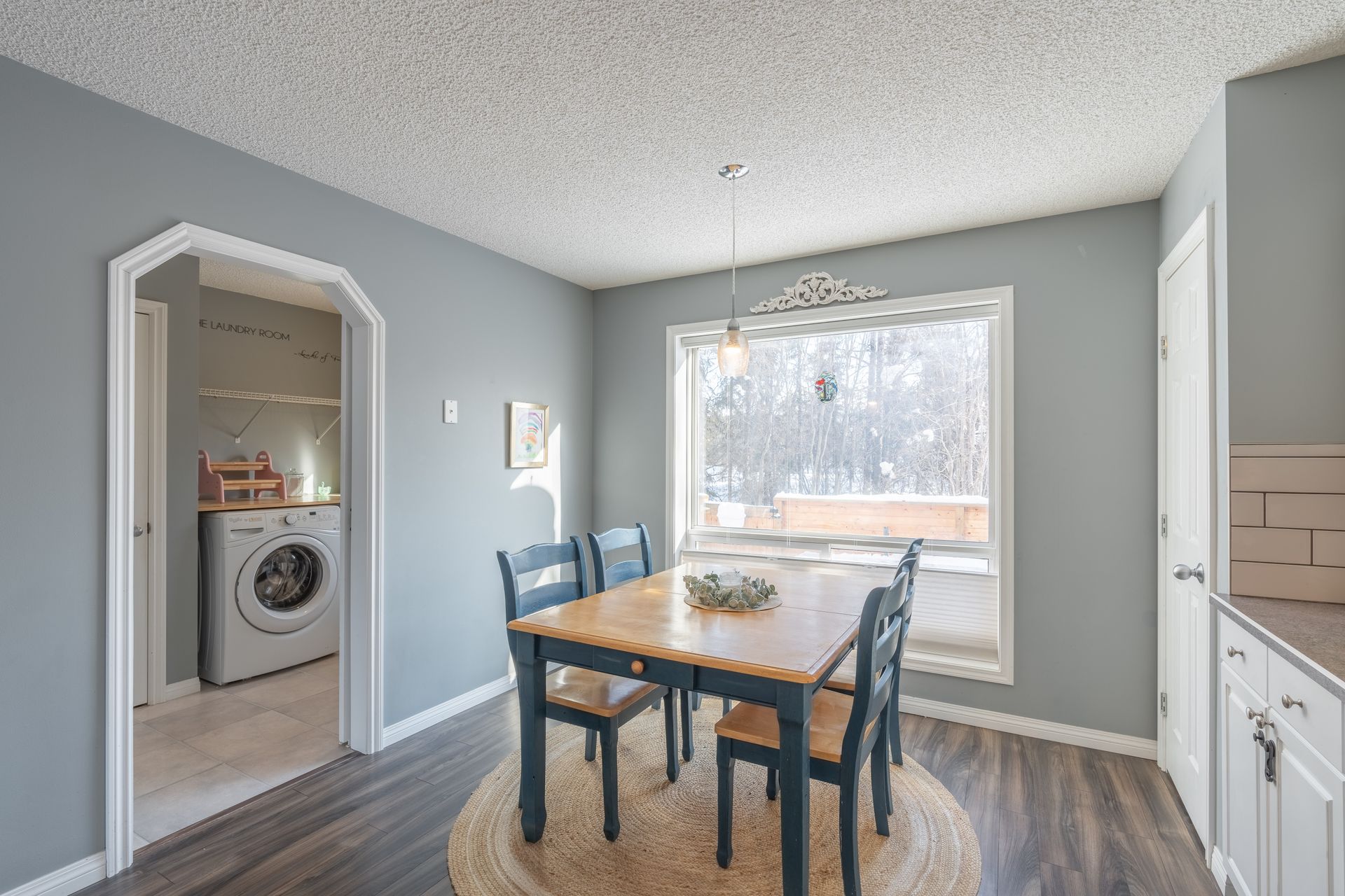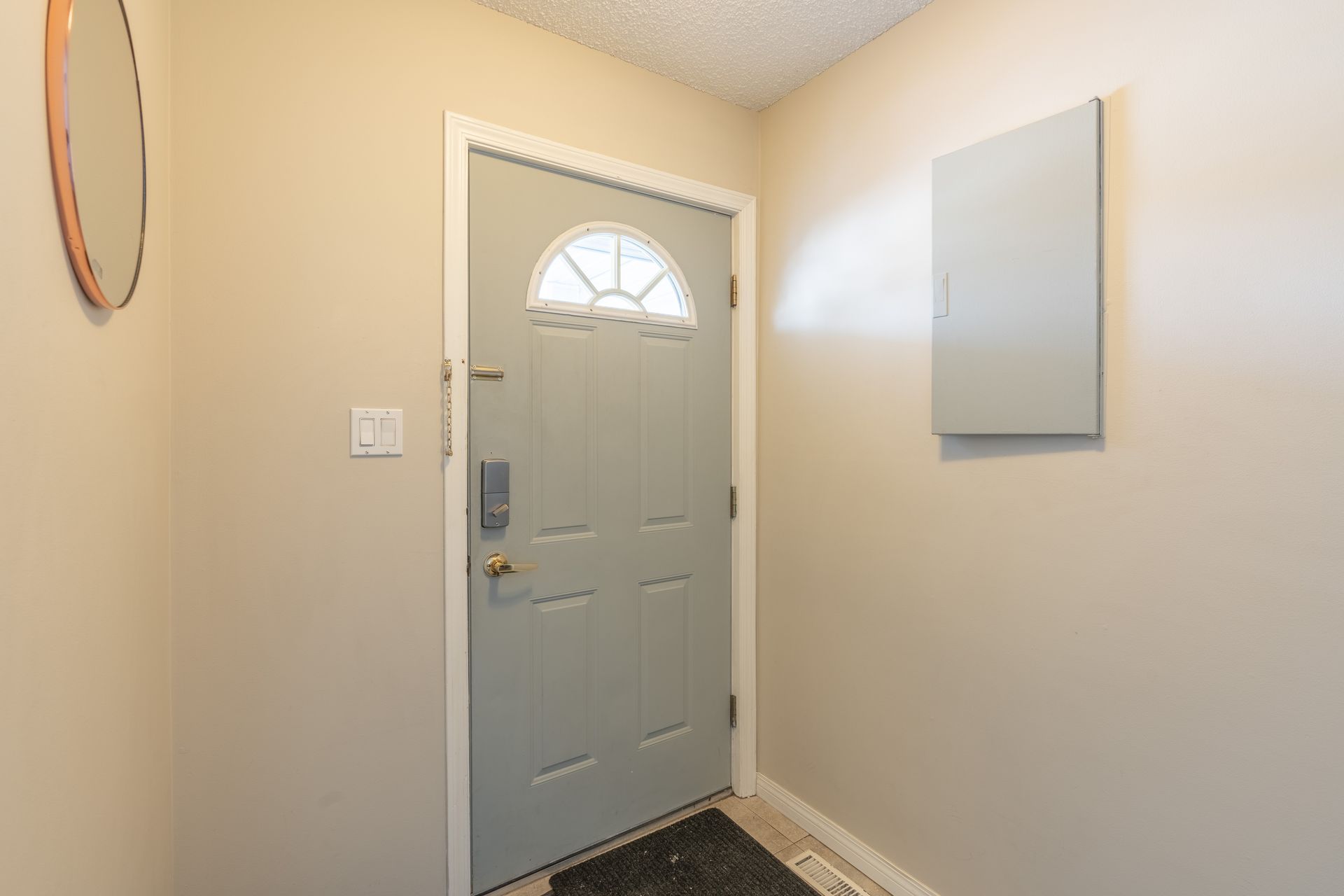 The entry features a glass door separating the foyer from the main living space to help keep the winter chill out, along with a spacious closet for jackets and added storage. The main level offers laminate flooring, updated trim, interior doors, and baseboards throughout.