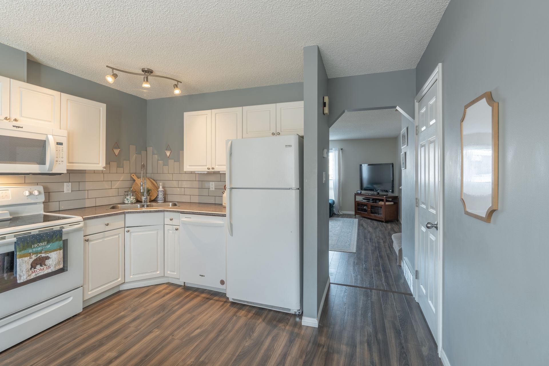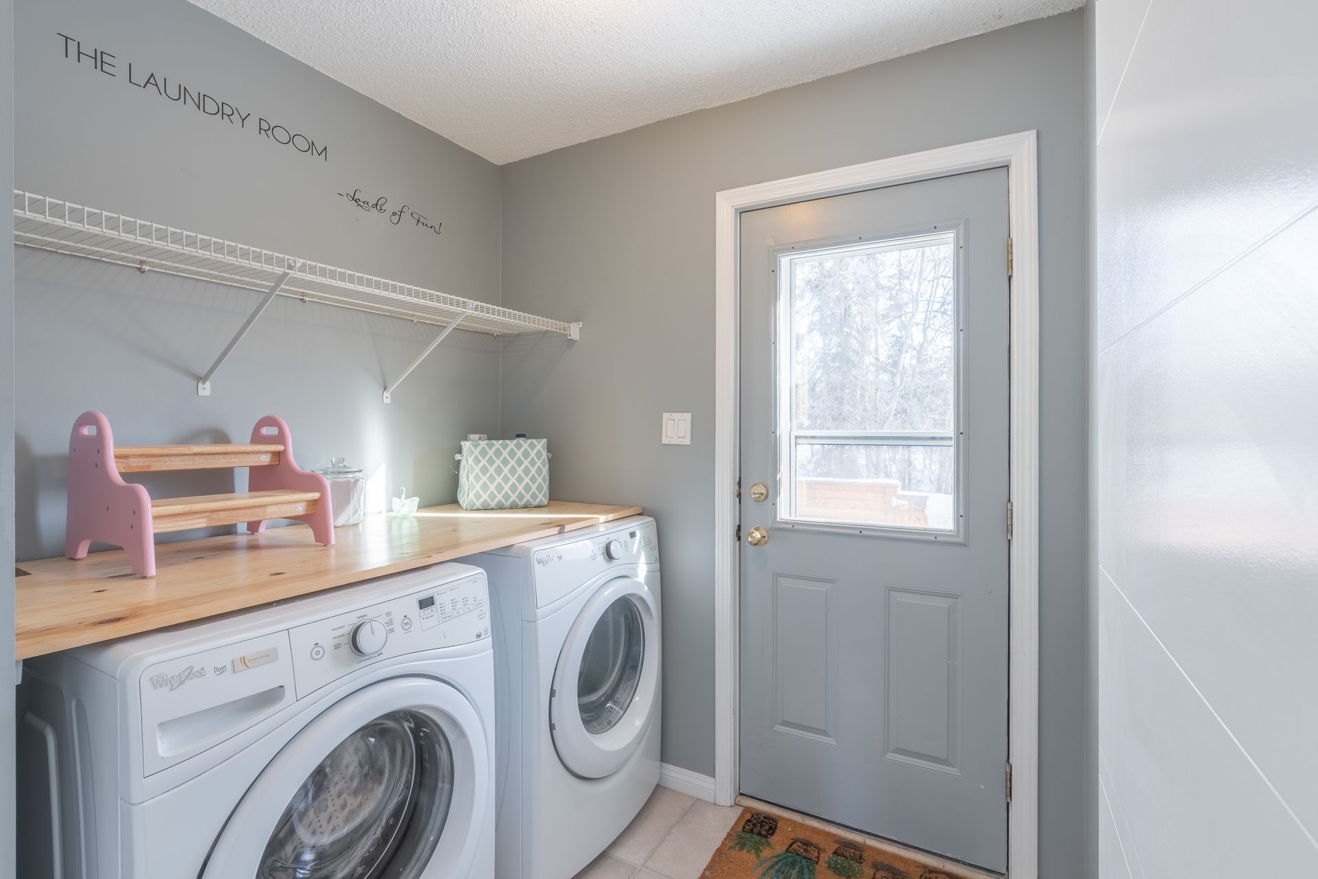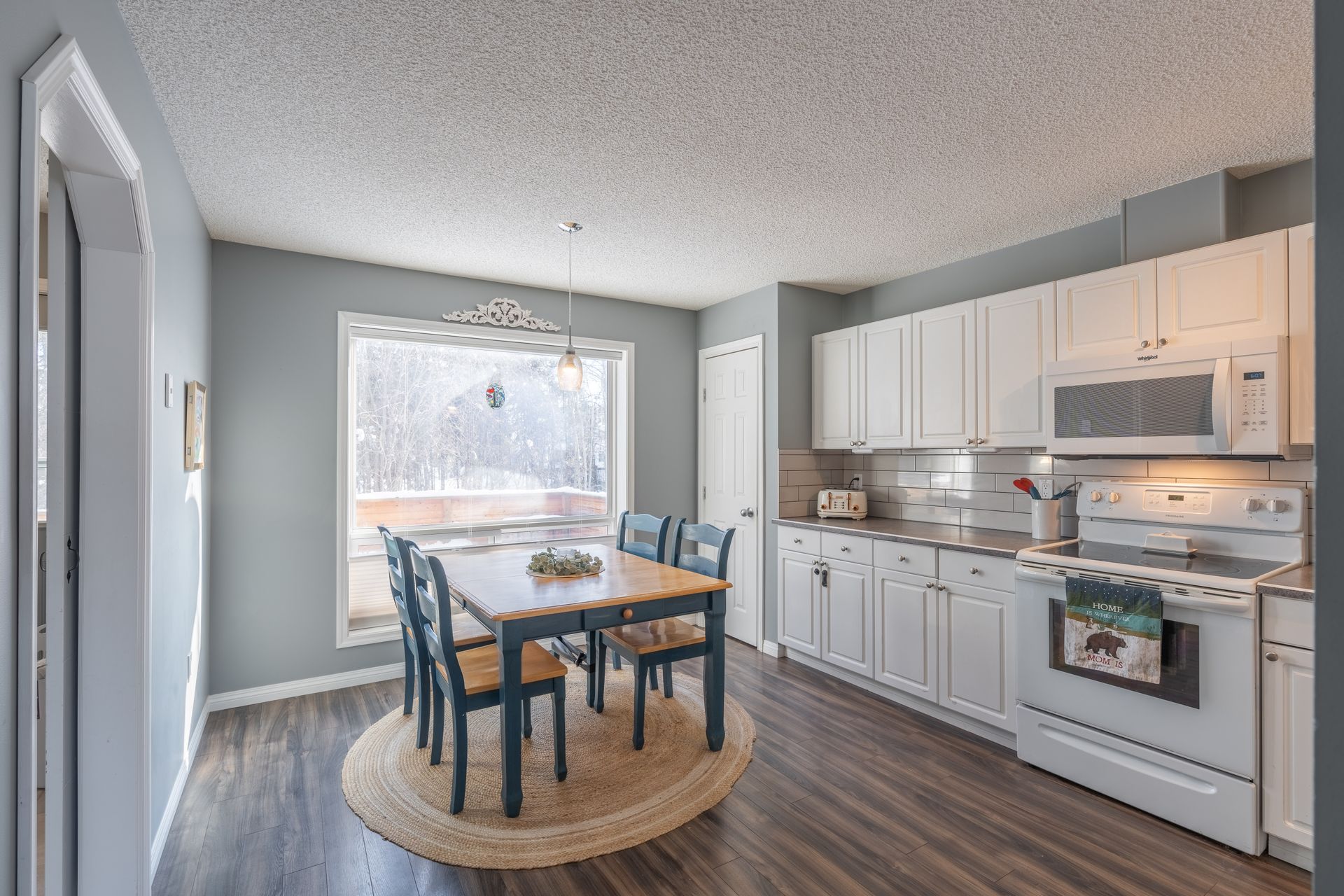 The kitchen is finished with a custom tile backsplash, crisp white appliances, pantry closet, and direct access to both the laundry room and the rear deck. A sliding barn door between the laundry room and kitchen adds a stylish touch.