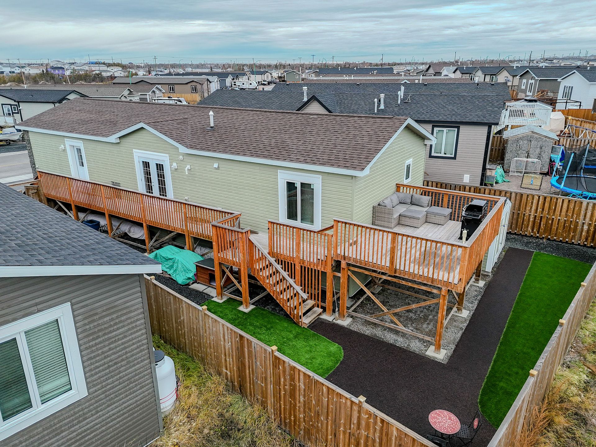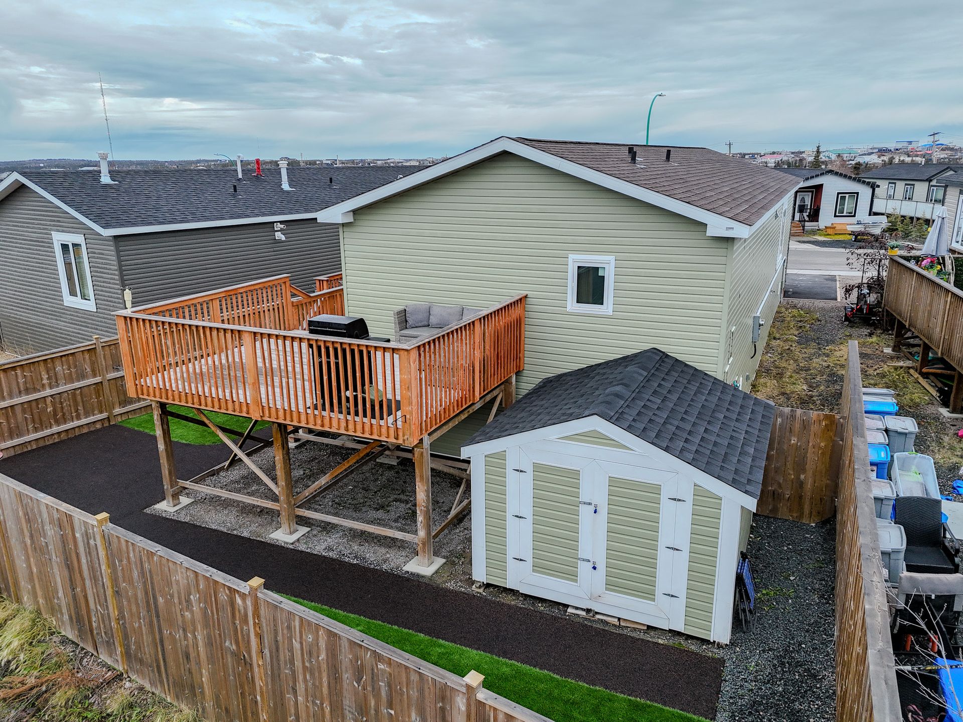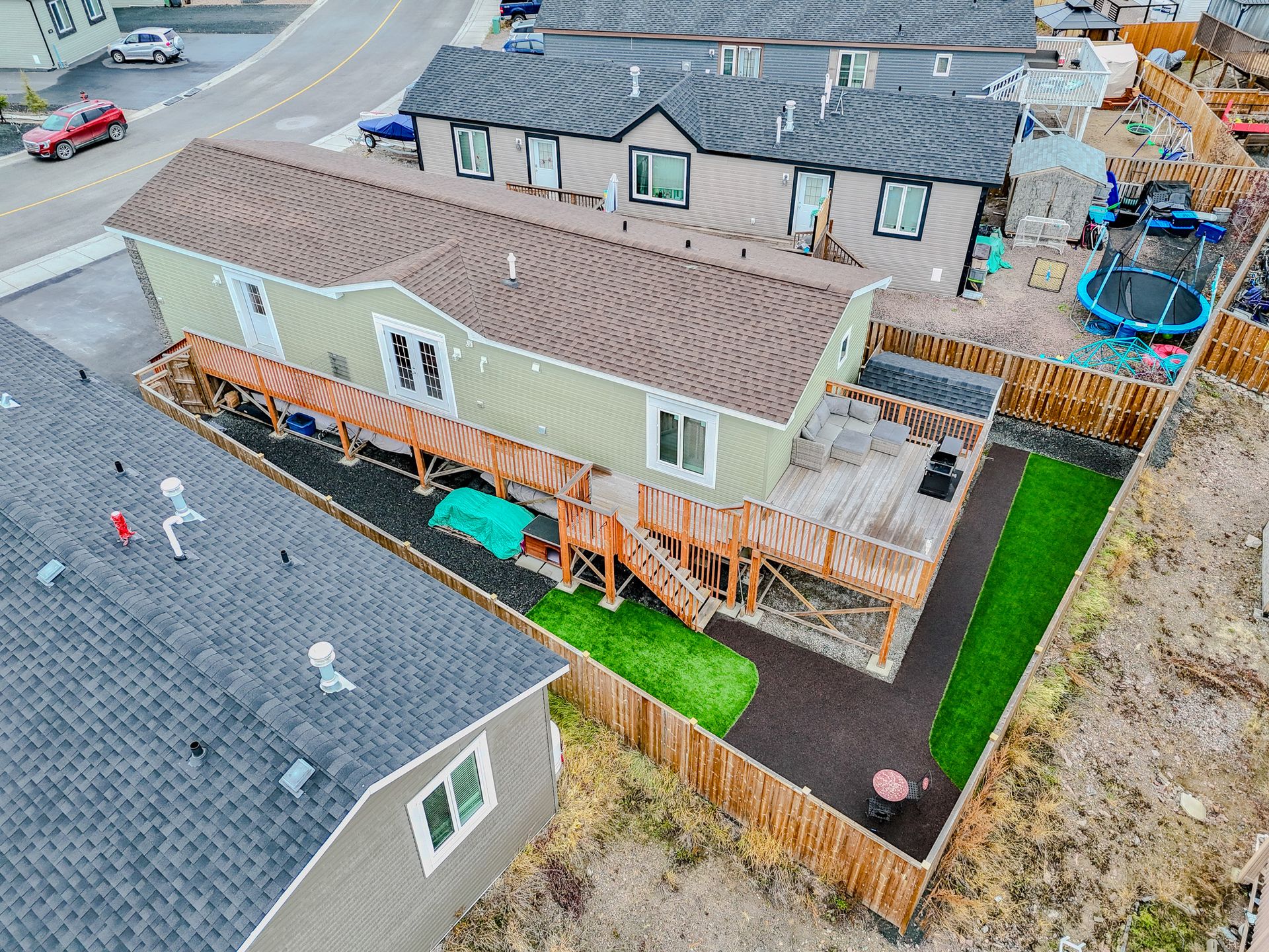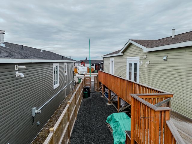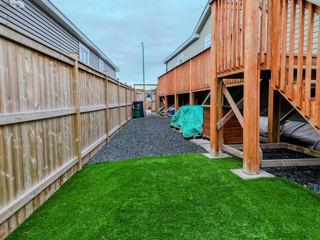 The fully fenced yard has been professionally landscaped by Arctic Turf, featuring three layers of weed barrier, crush stone, two sections of artificial turf, and a recycled rubber pathway with a sitting area. A custom wired shed adds extra utility and the rear deck offers outstanding morning sun and views of Kam Lake. The front offers parking for up to four vehicles.
