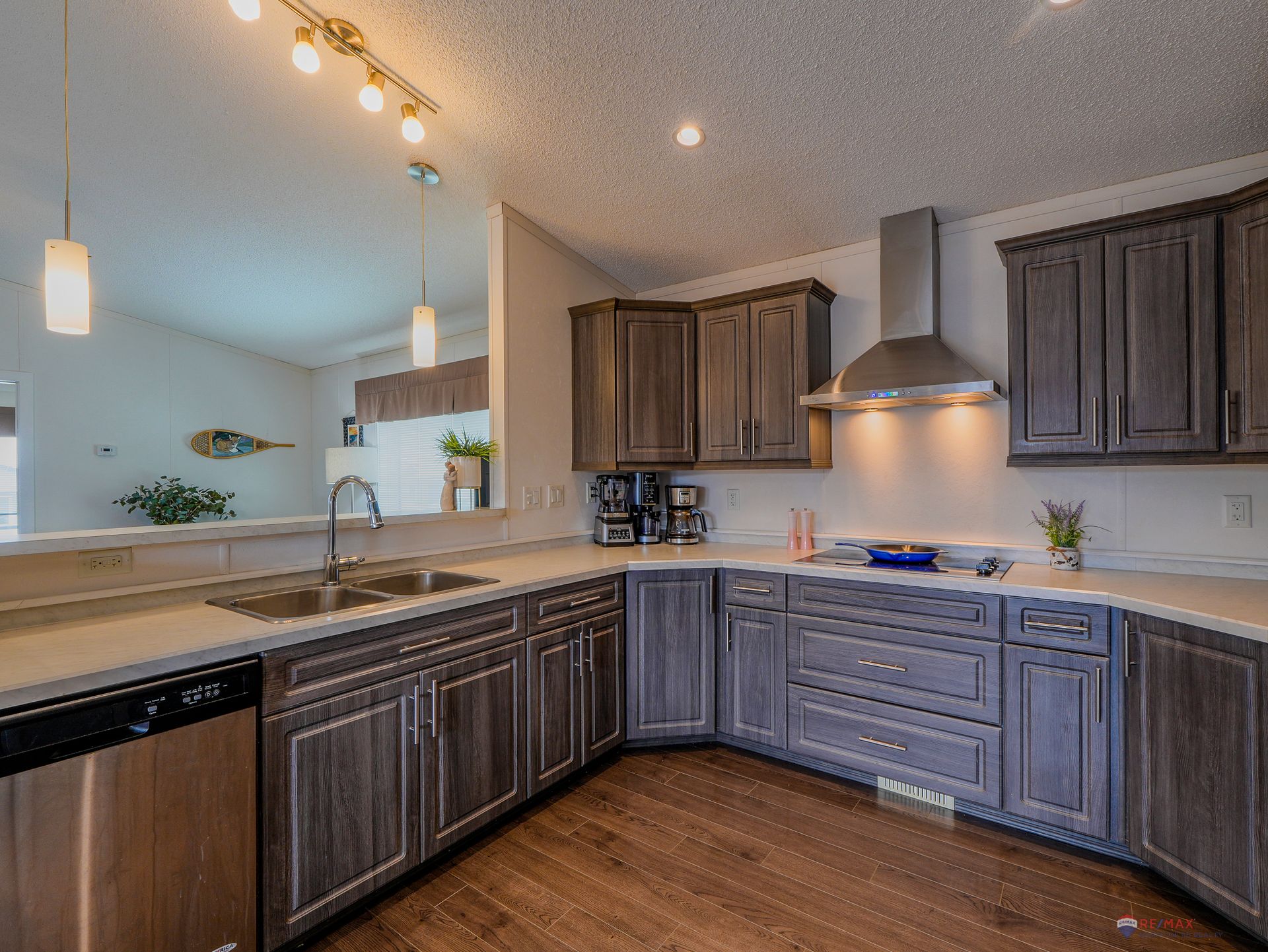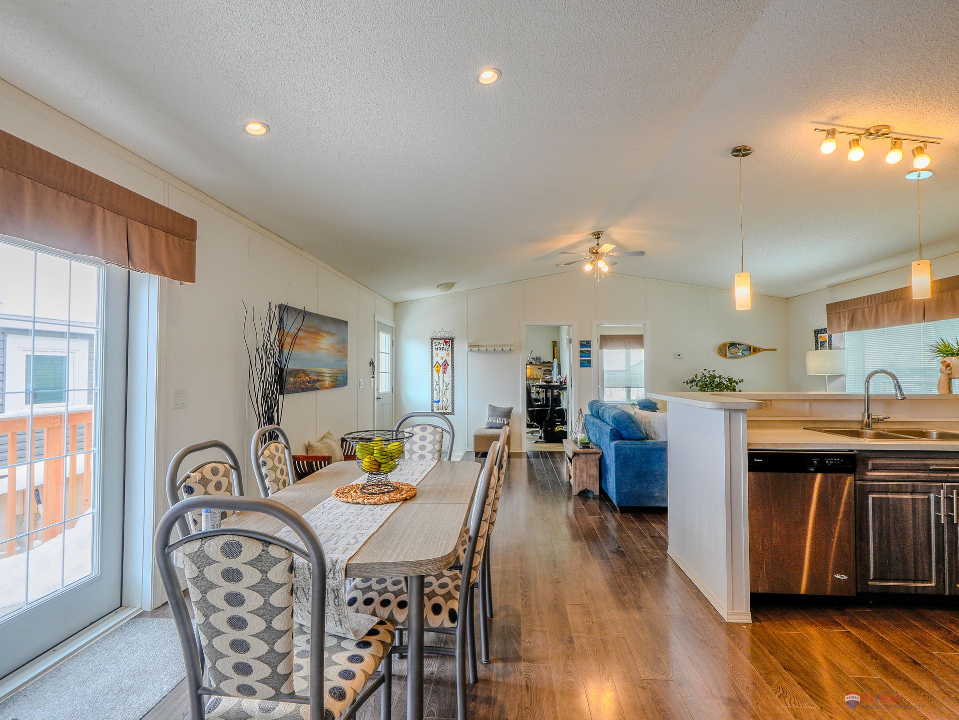 Bright and invi…ting, the home is filled with natural light from large triple-pane windows, complemented by pot lighting in the kitchen and above the dining area. A garden door off the dining space provides easy access for summer BBQs. The U-shaped kitchen is both functional and stylish, showcasing PVC pewter pine cabinetry in a light grey finish, complete with upgraded hardware, soft-close drawers, and a raised eating bar with pendant lighting.