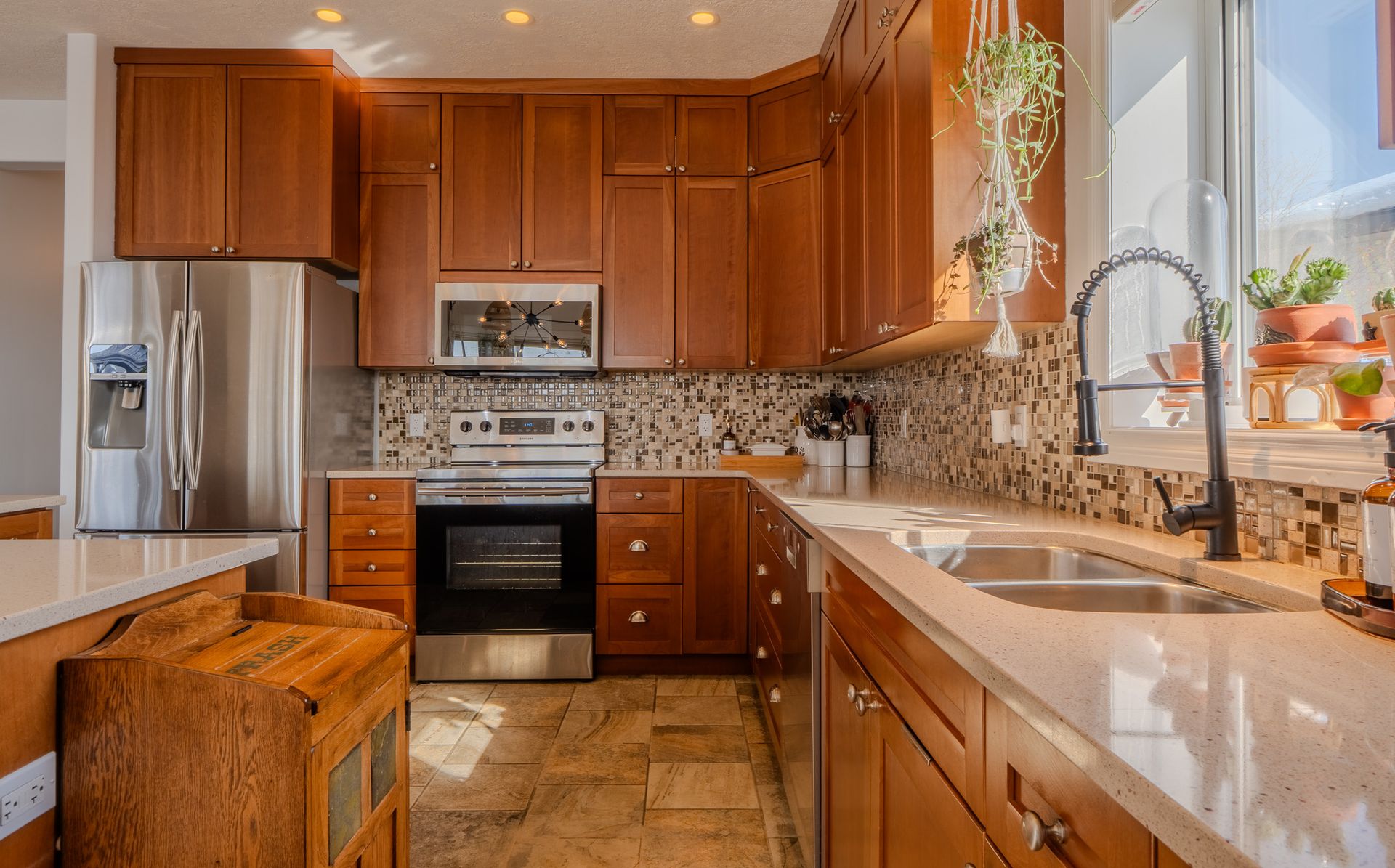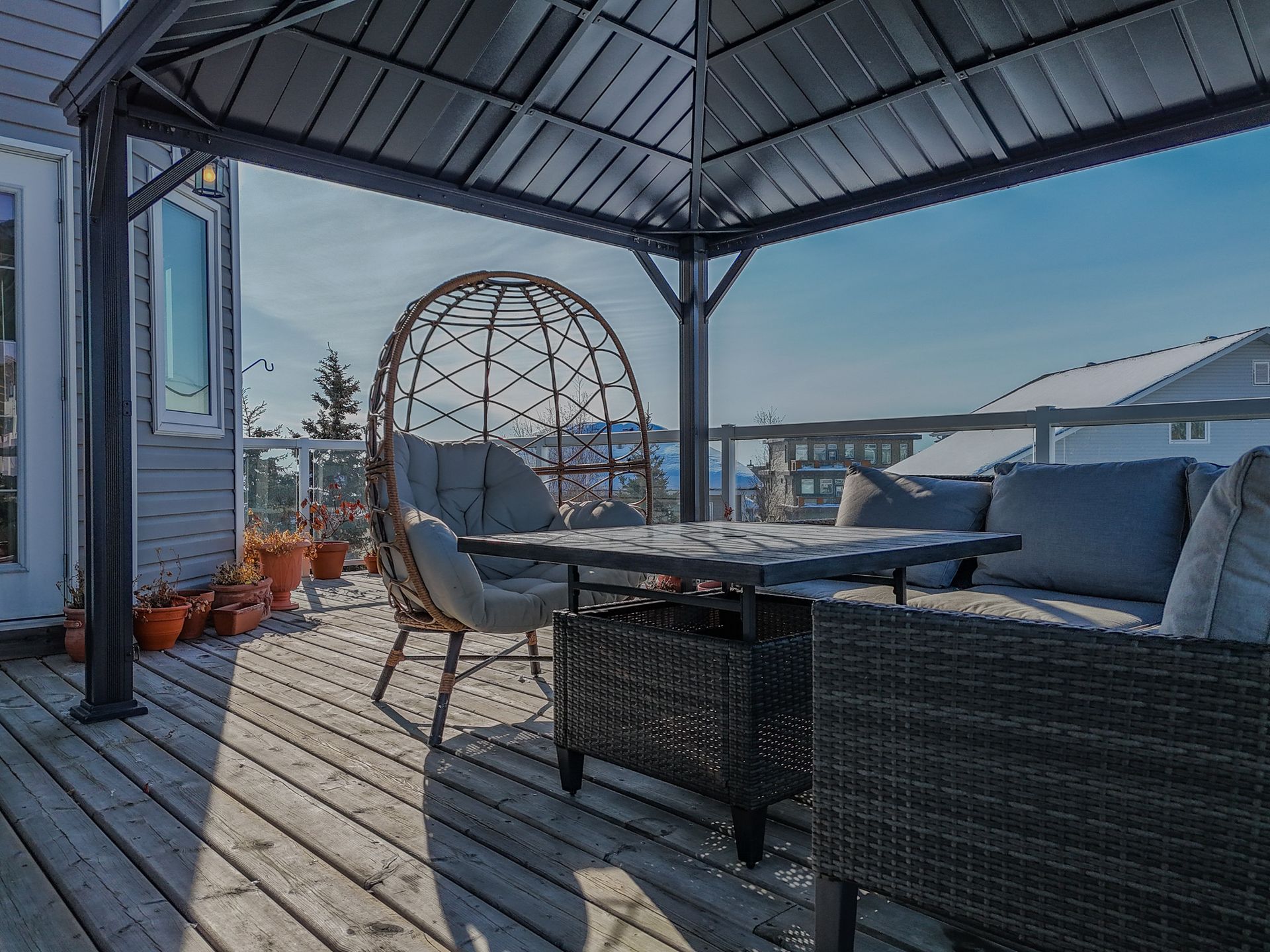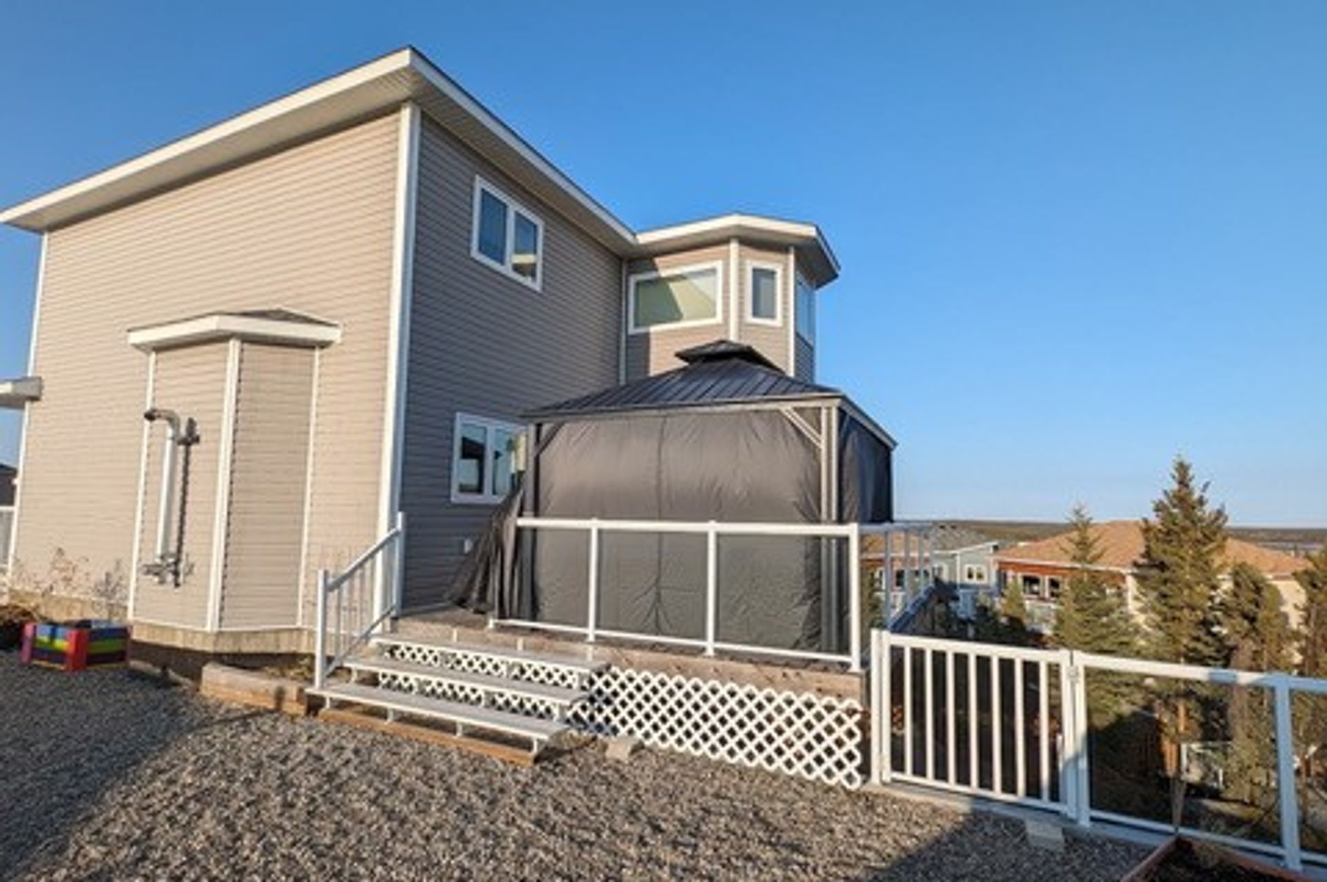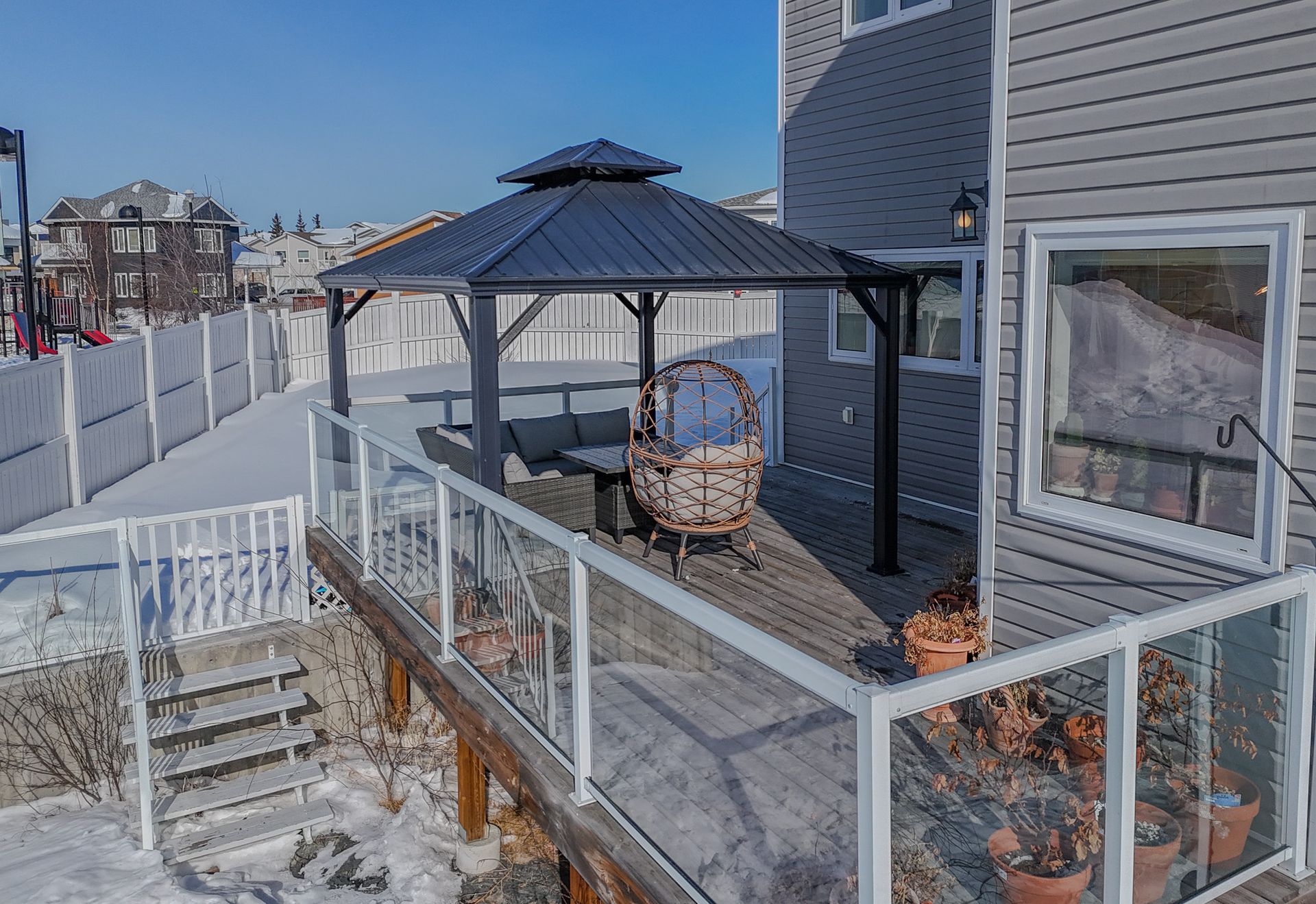 The south-facing backyard is fully fenced, beautifully landscaped, and entirely maintenance-free with artificial turf and river rock. Enjoy unobstructed views from the large deck with aluminum and glass railings, plus a charming gazebo ideal for relaxing or entertaining. The yard also offers direct access to a community park, making it perfect for families with children.