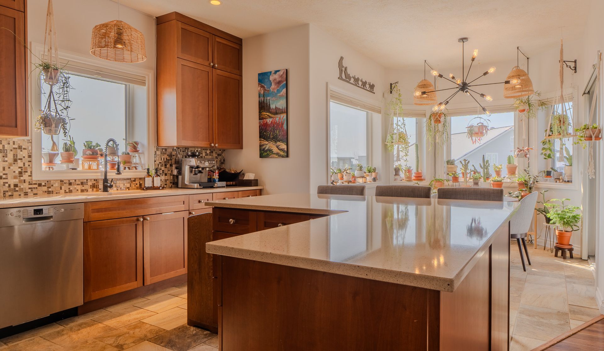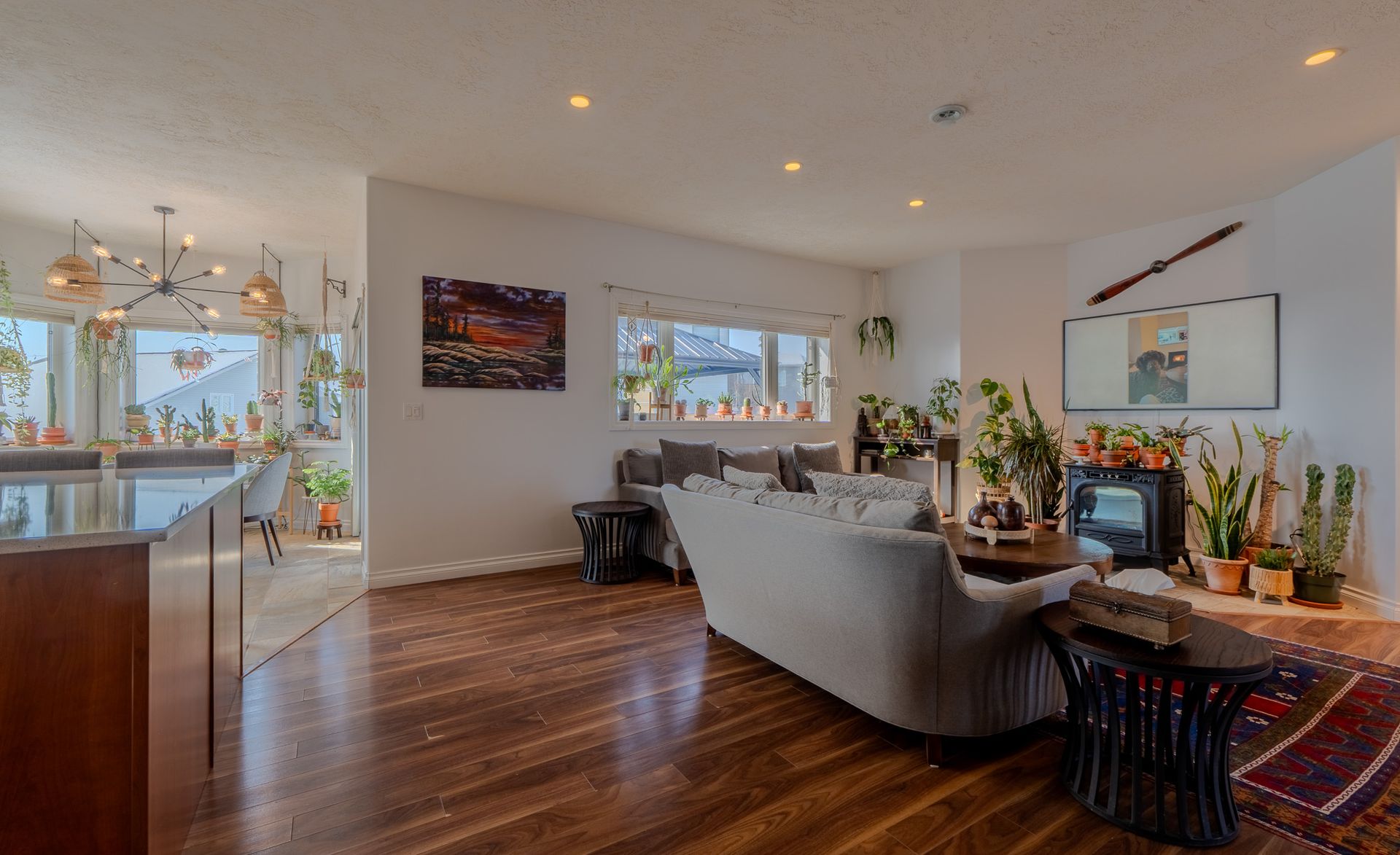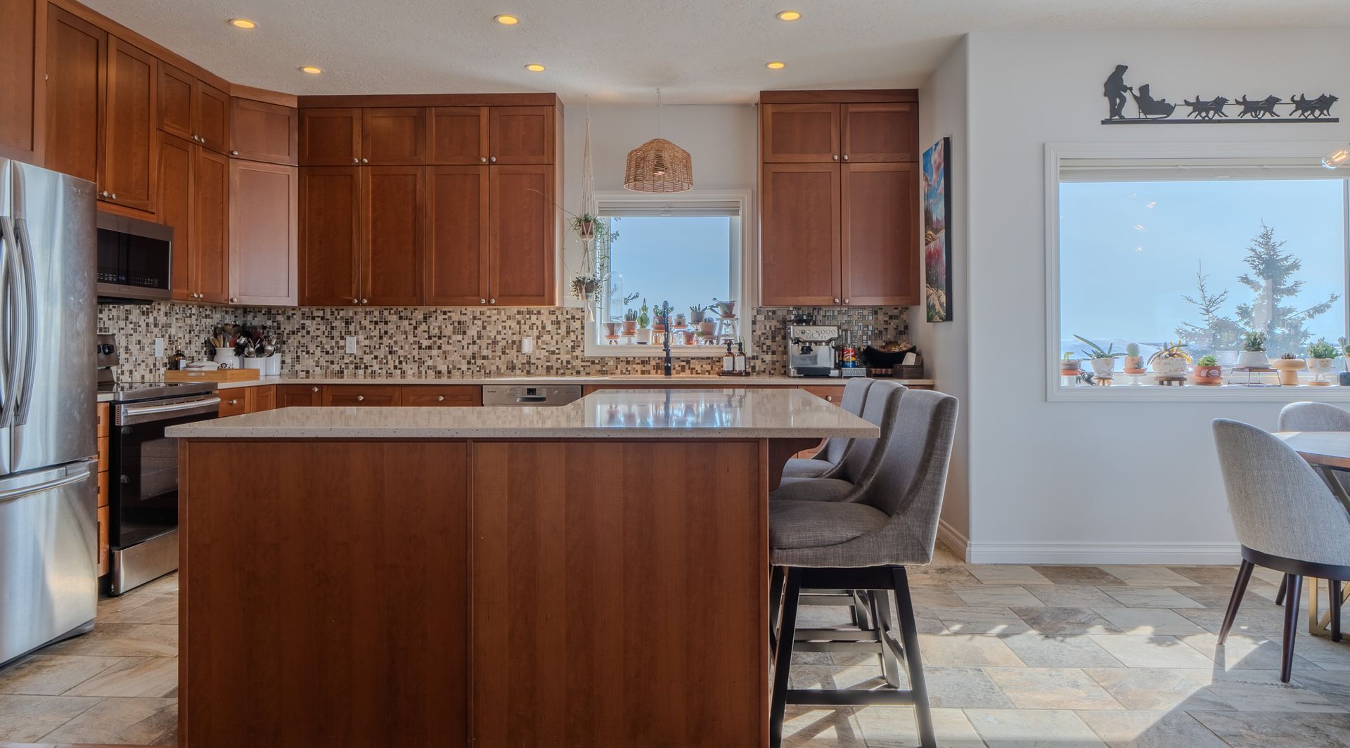 The open-concept main floor is designed for both everyday living and entertaining, featuring a chef-inspired kitchen with full-height wood cabinetry, soft-close drawers, quartz countertops, a large island with breakfast bar, and premium appliances. The dining area provides direct access to the expansive deck, while the living room is anchored by a cozy Harman pellet stove.