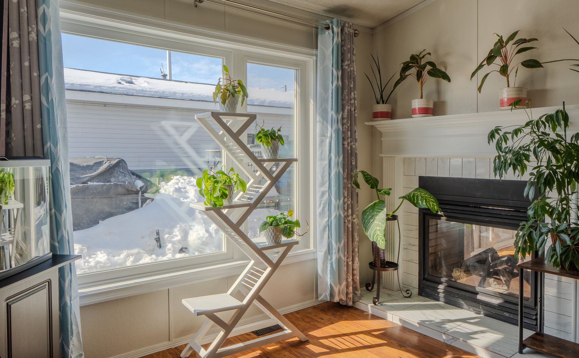 The spacious kitchen offers stainless steel appliances and a pantry, flowing seamlessly into the living and dining areas, where a cozy two-sided propane fireplace adds warmth and charm.