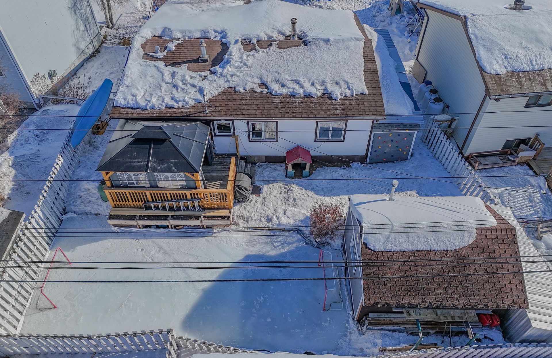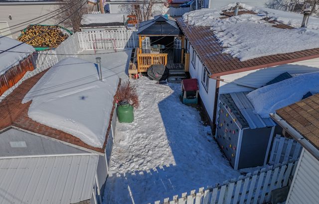 The fully fenced, south-facing backyard features a 128 sq. ft. deck, large, raised flower/garden beds, and a heated workshop/storage shed.