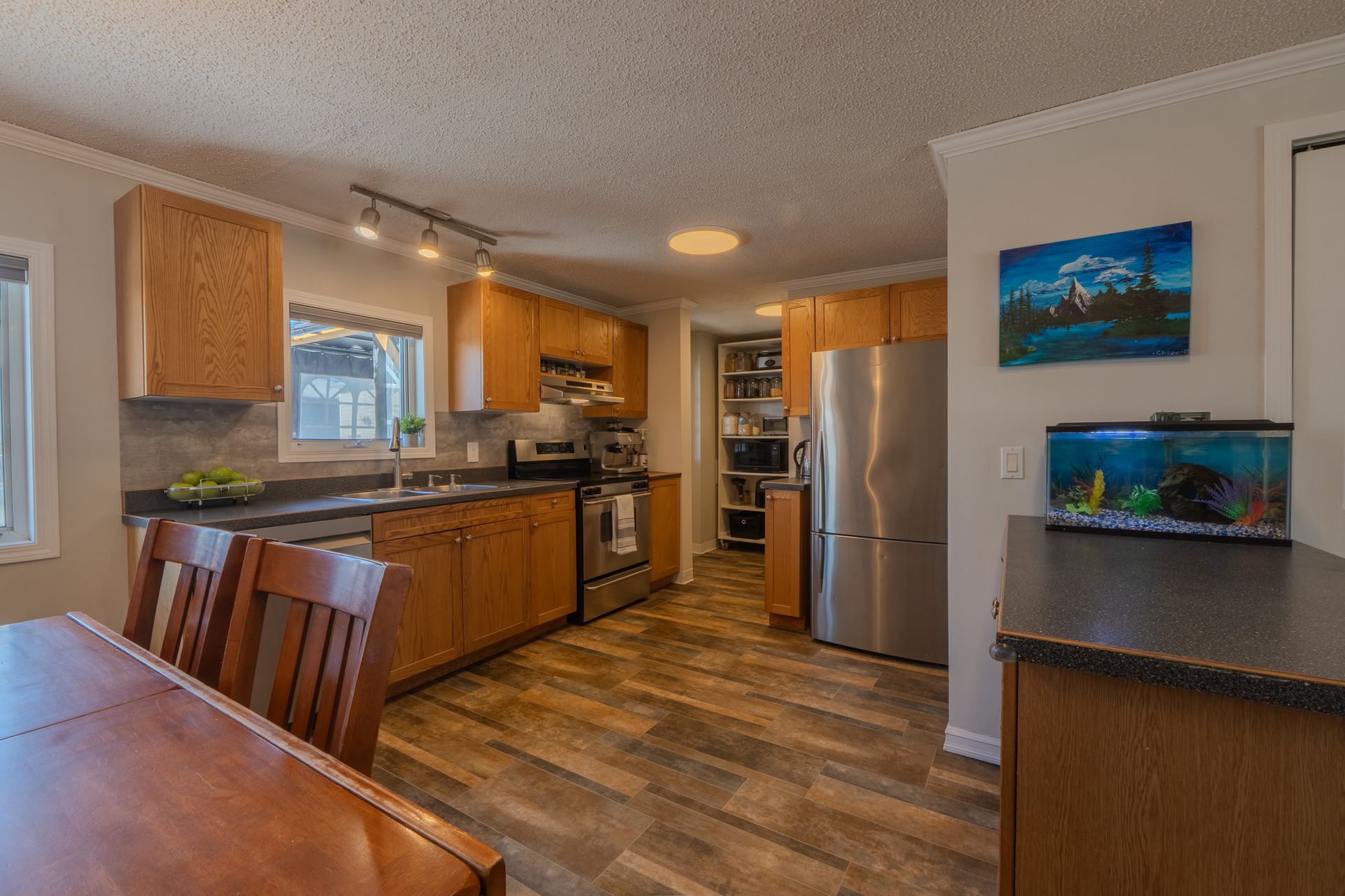 The home welcomes you with a spacious entry leading into the open-concept living space, featuring a centrally located wood-burning stove, sunken living room, and a functional kitchen with plenty of counter space. The spacious primary bedroom offers an updated 3-piece ensuite, along with two additional bedrooms and a second full bathroom.